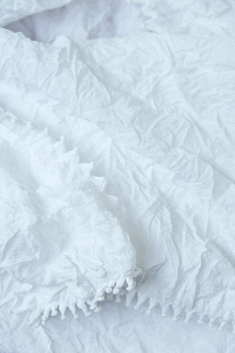 For Kumo-shibori, part of the cloth is tied by hand and dyed. After dyeing, the tied part is untied and a spiderweb pattern is revealed (kumo means spider in Japanese ). However, HaaT focuses on the shibori in its tied state, and aims to make the beautiful, organic form of the shibori be remembered in the garments. Created based on this aim, the KUMOSHIBORI series applies the shape-memory property of polyester and incorporates the bumps of the shibori into the design.