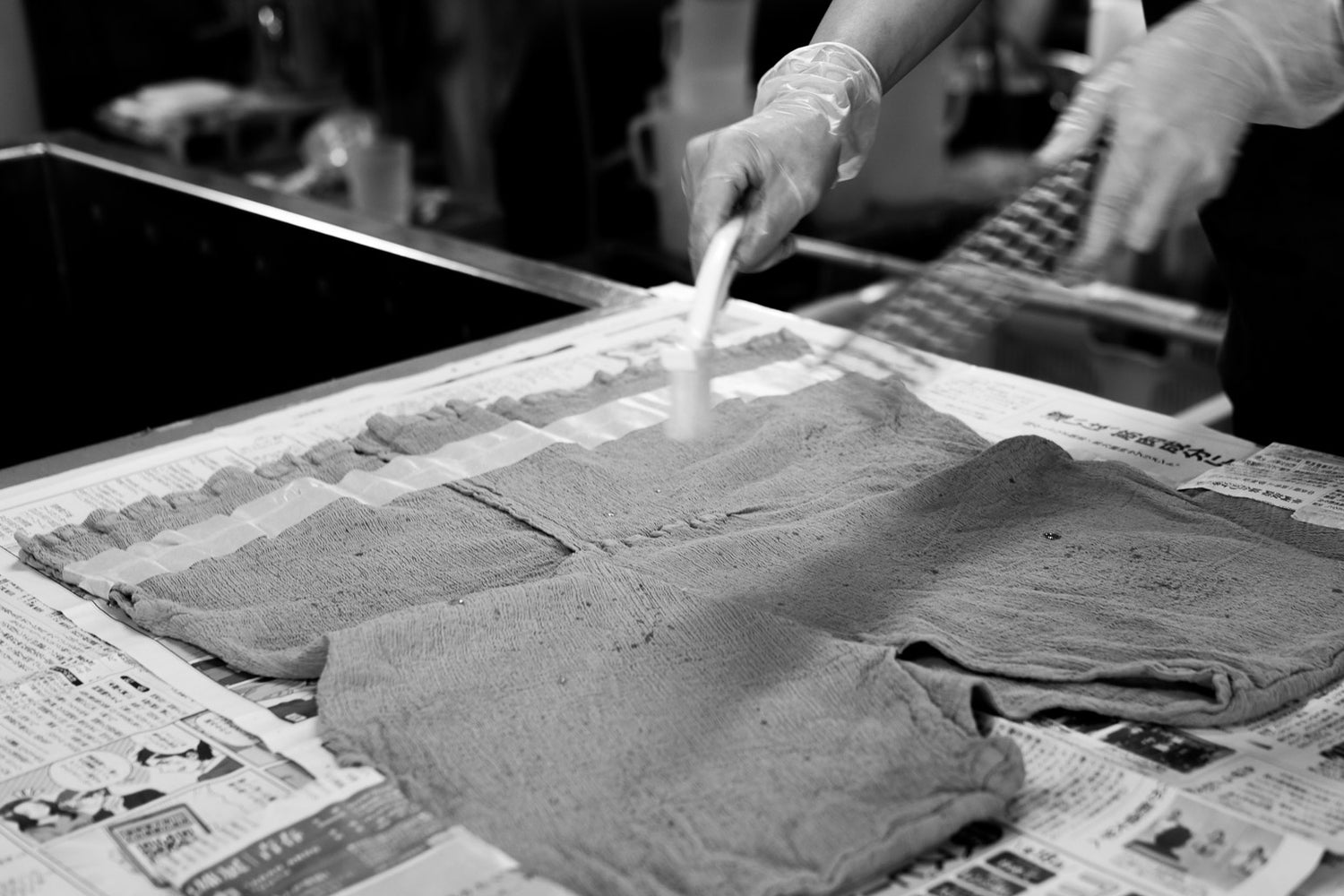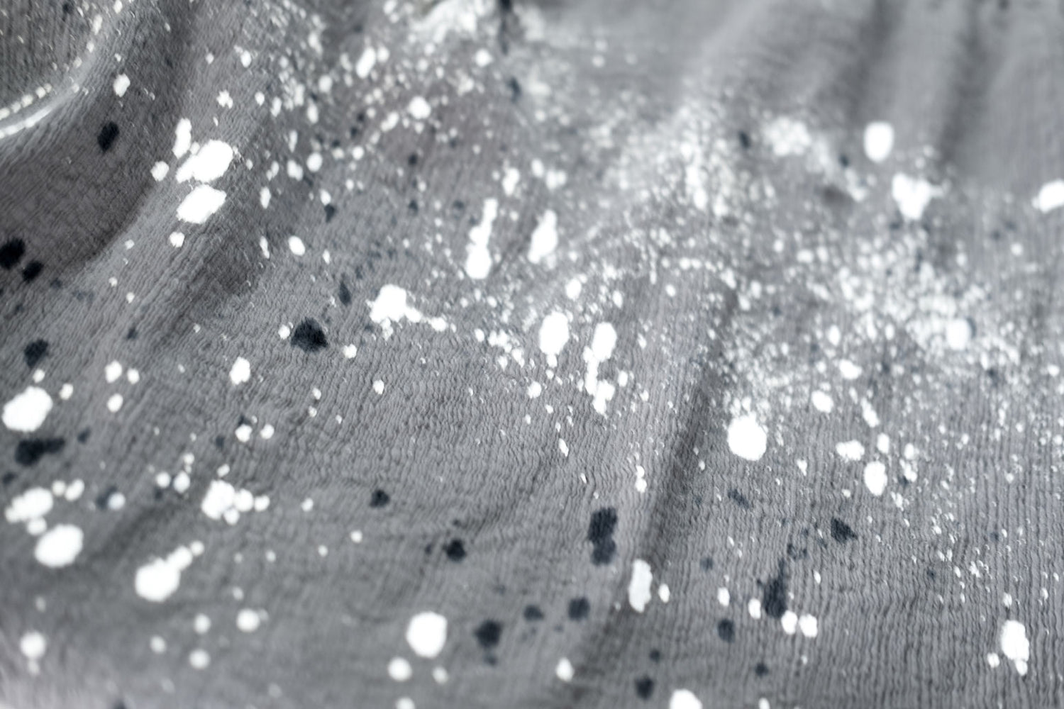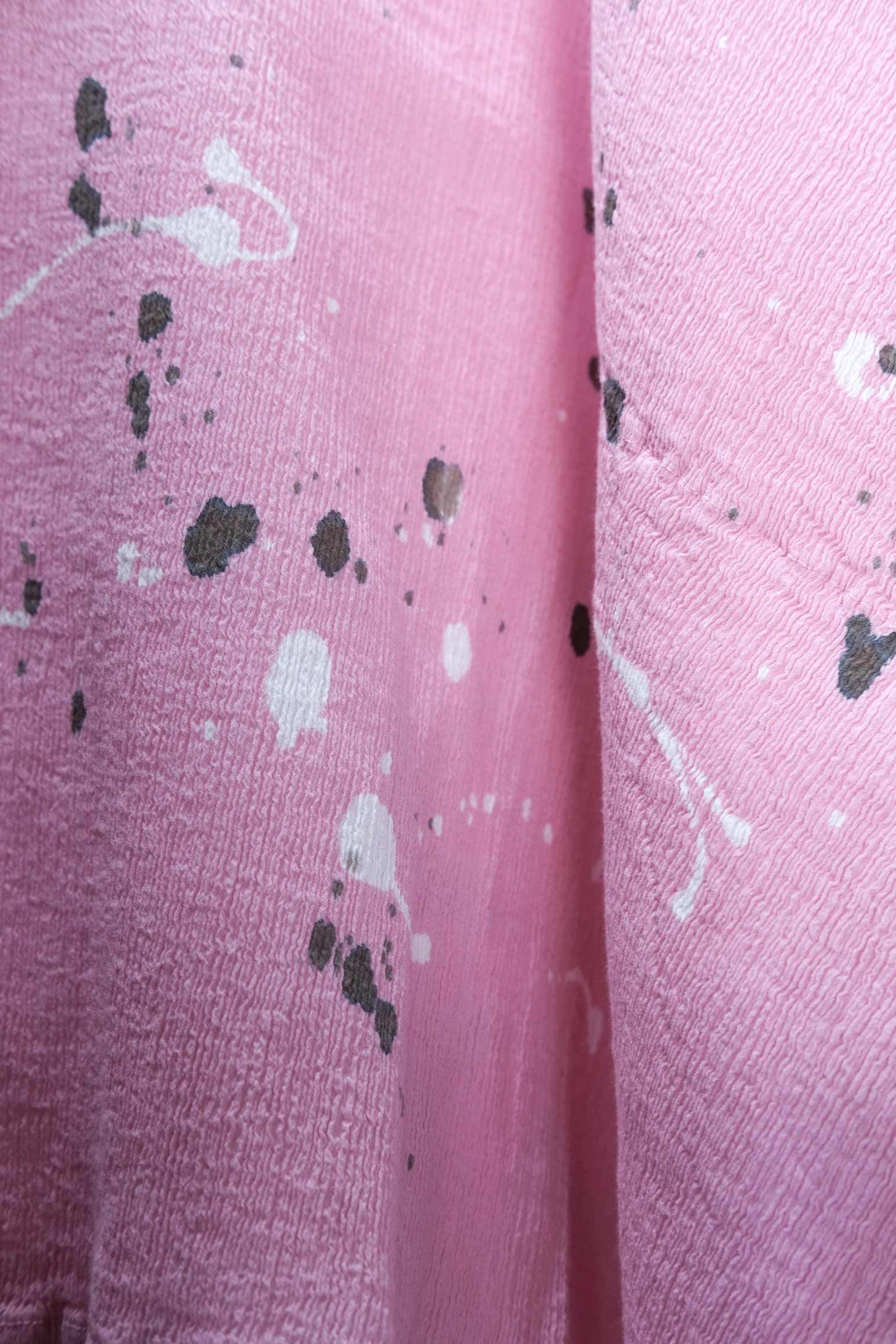 The creative process is a modern riff on traditional Japan. The methods are rooted in old techniques long used by obi makers, kimono dyers and painters, who typically used bamboo tools to wrist-flick glues, dyes, inks and paints – particularly when evoking atmospheric natural scenes, from snowfall to misty skies. For FRIKAKE, the artisans’ movements seem still, even, measured – yet the process hovers perfectly along the fine line between masterly control and wild beauty. The end result? Surface scatterings imbued with a spirit of freedom and joyful spontaneity. Meanwhile, imperfections meld into the creative process. Light bleeding irregularly occurs along the taped lines. The outcome is further impacted by humidity levels in different seasons of the year. Artisans balance technical expertise without being overly controlling – instead, embracing the edges of imperfection more typically found in the natural world. These artisans are unwavering masters of their dyeing skills not only through their actions, but also by knowing when to surrender to elements of the process beyond human control – as perfectly embodied by the scattered beauty of the FRIKAKE series.
