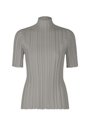 Ce top gris plissé à manches courtes possède une coupe ajustée et un col montant.