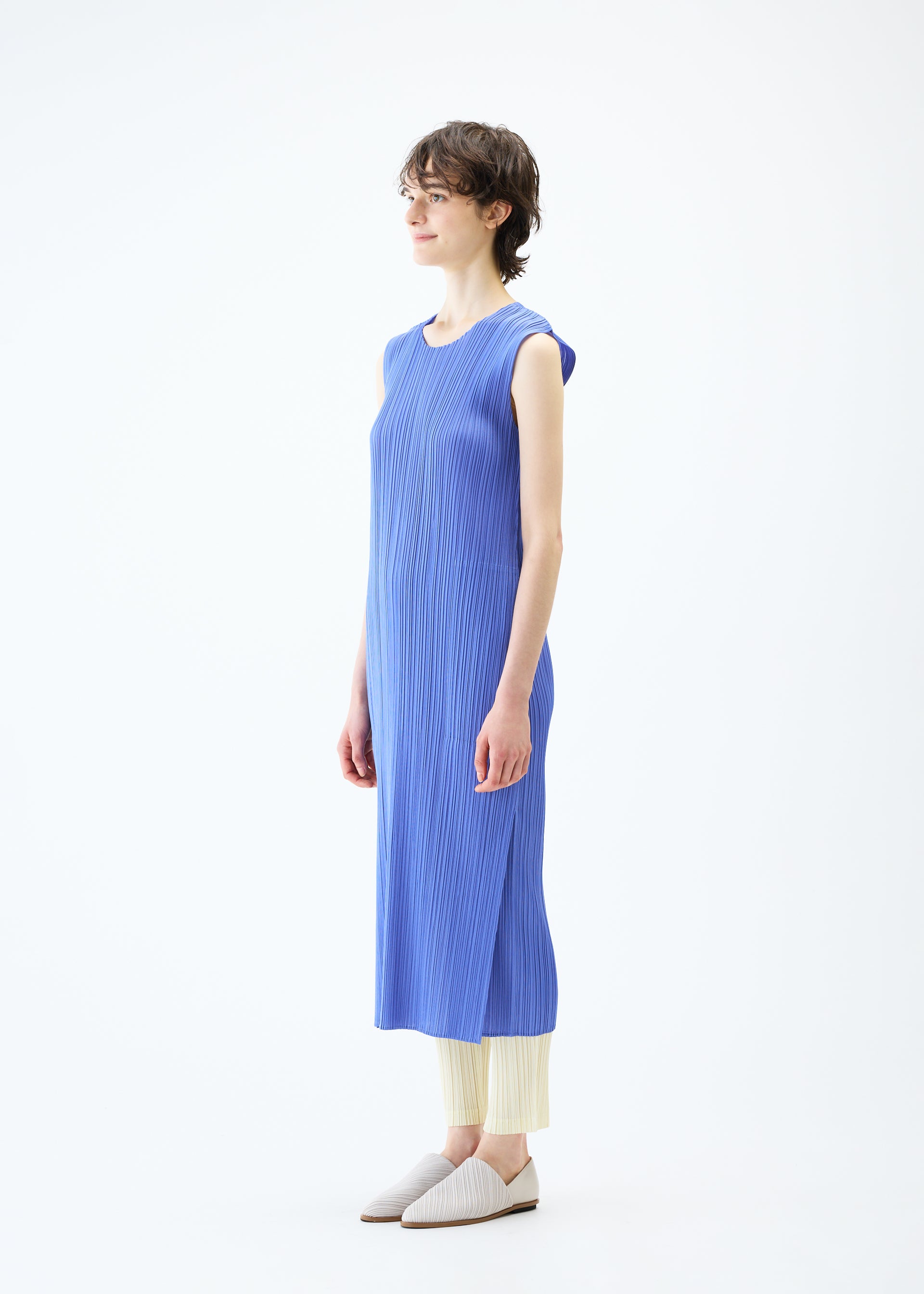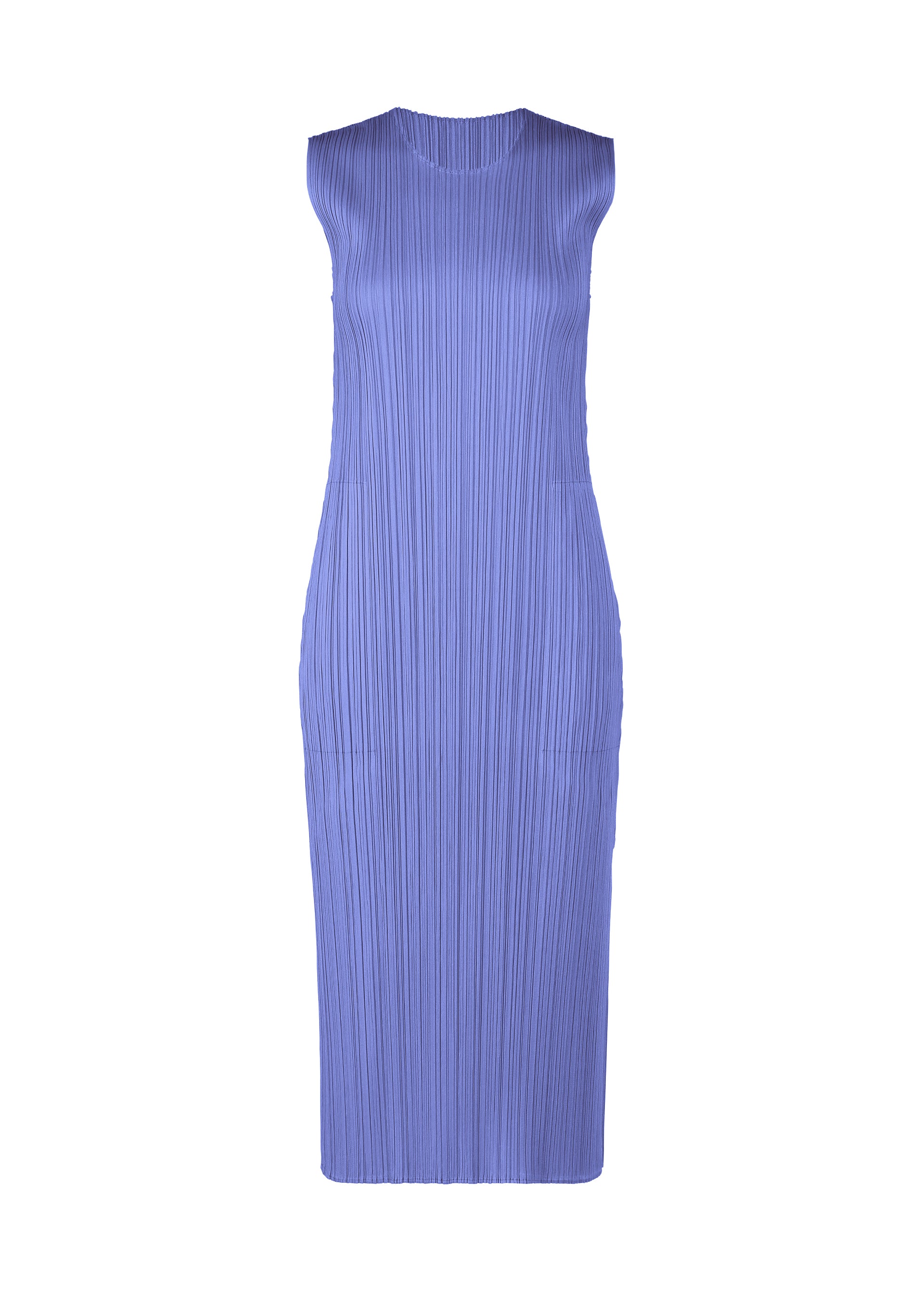 This sleeveless pleated midi dress in steel blue has an A-line silhouette, side pockets and high slits.